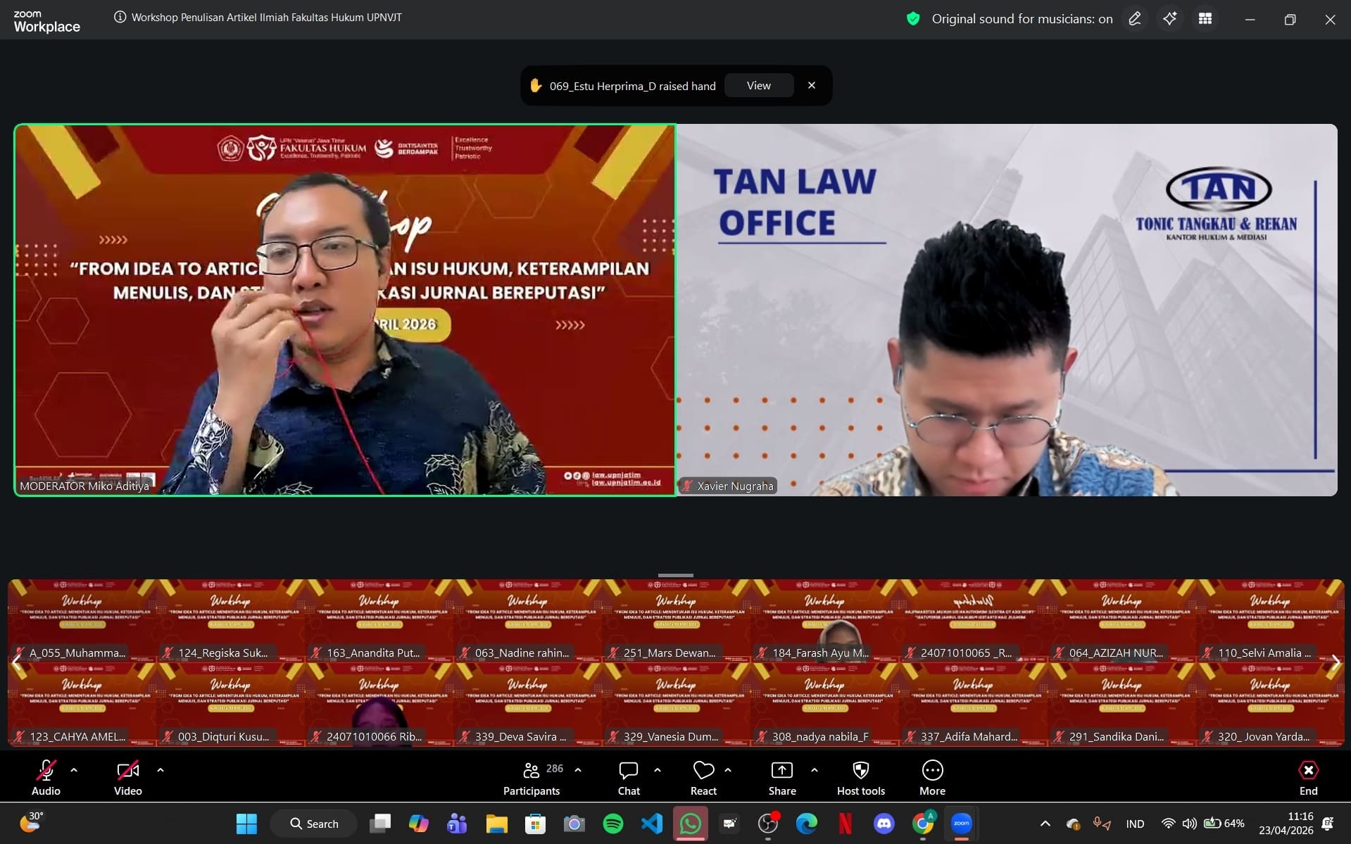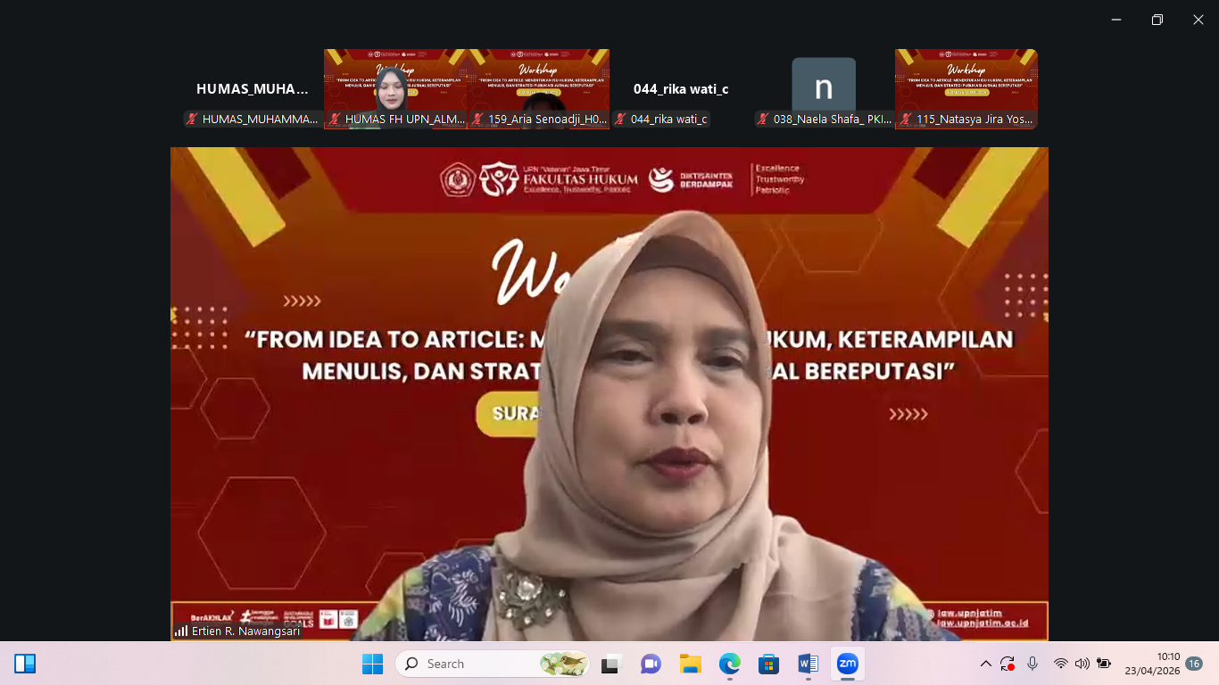 Surabaya, 23 April 2026 – Fakultas Hukum UPN “Veteran” Jawa Timur sukses menyelenggarakan kegiatan strategis bertajuk “From Idea to Article: Menentukan Isu Hukum, Keterampilan Menulis, dan Strategi Publikasi Jurnal Bereputasi” pada Kamis (23/4) melalui Zoom Meeting. Acara ini secara khusus menghadirkan Bapak Xavier Nugraha, S.H., seorang praktisi dan akademisi yang memiliki rekam jejak impresif dengan capaian sekitar 26 publikasi pada jurnal terindeks Scopus. Kehadiran narasumber ahli ini bertujuan untuk memberikan panduan praktis bagi mahasiswa semester akhir dan mahasiswa semester 4 mata kuliah Penulisan Karya Ilmiah Hukum agar mampu menembus standar publikasi yang ketat.