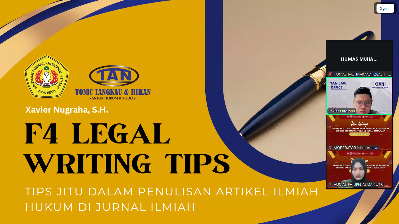 Memasuki sesi inti, Bapak Xavier Nugraha membedah materi F4 (Fantastic Four) Legal Writing Tips yang berfokus pada teknik menemukan isu hukum yang tajam melalui analisis kekosongan, pertentangan, maupun kekaburan aturan. Beliau menjelaskan bahwa penentuan rumusan masalah tidak selalu harus menggunakan kalimat tanya, melainkan dapat berupa pernyataan yang menggabungkan berbagai teori hukum sebagai pisau analisis. Selain itu, teknik pembuatan judul yang sederhana namun memiliki unsur click bait ditekankan agar artikel memiliki daya tarik tinggi di mata reviewer jurnal bereputasi.