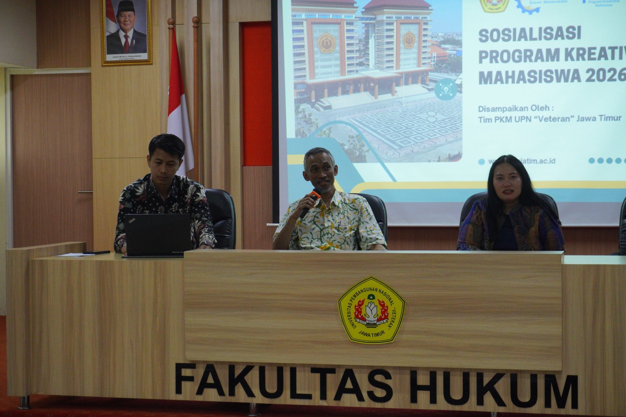 Surabaya, 12 April 2026 – Fakultas Hukum UPN “Veteran” Jawa Timur menggelar kegiatan Sosialisasi Program Kreativitas Mahasiswa (PKM) yang diikuti oleh pimpinan fakultas, dosen muda, serta mahasiswa. Kegiatan ini diselenggarakan sebagai upaya untuk meningkatkan pemahaman mahasiswa mengenai program PKM sekaligus mendorong partisipasi aktif mahasiswa dalam menyusun dan mengajukan proposal yang berkualitas. Kegiatan ini menjadi wadah bagi mahasiswa untuk memahami strategi penyusunan proposal yang baik serta meningkatkan peluang lolos pendanaan PKM.