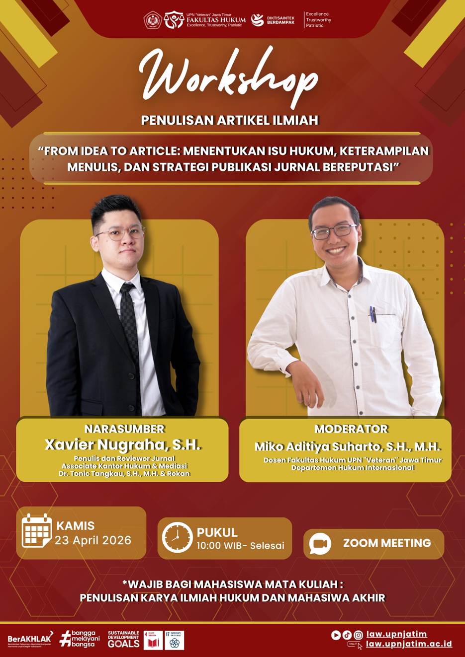 Fakultas Hukum UPN “Veteran” Jawa Timur menyelenggarakan Workshop Penulisan Artikel Ilmiah “From Idea to Article: Menentukan Isu Hukum, Keterampilan Menulis, dan Strategi Publikasi Jurnal Bereputasi.” Kegiatan ini akan membekali peserta dengan pemahaman dalam menentukan isu hukum yang tepat, meningkatkan keterampilan menulis ilmiah, serta strategi menembus publikasi pada jurnal bereputasi. 📚