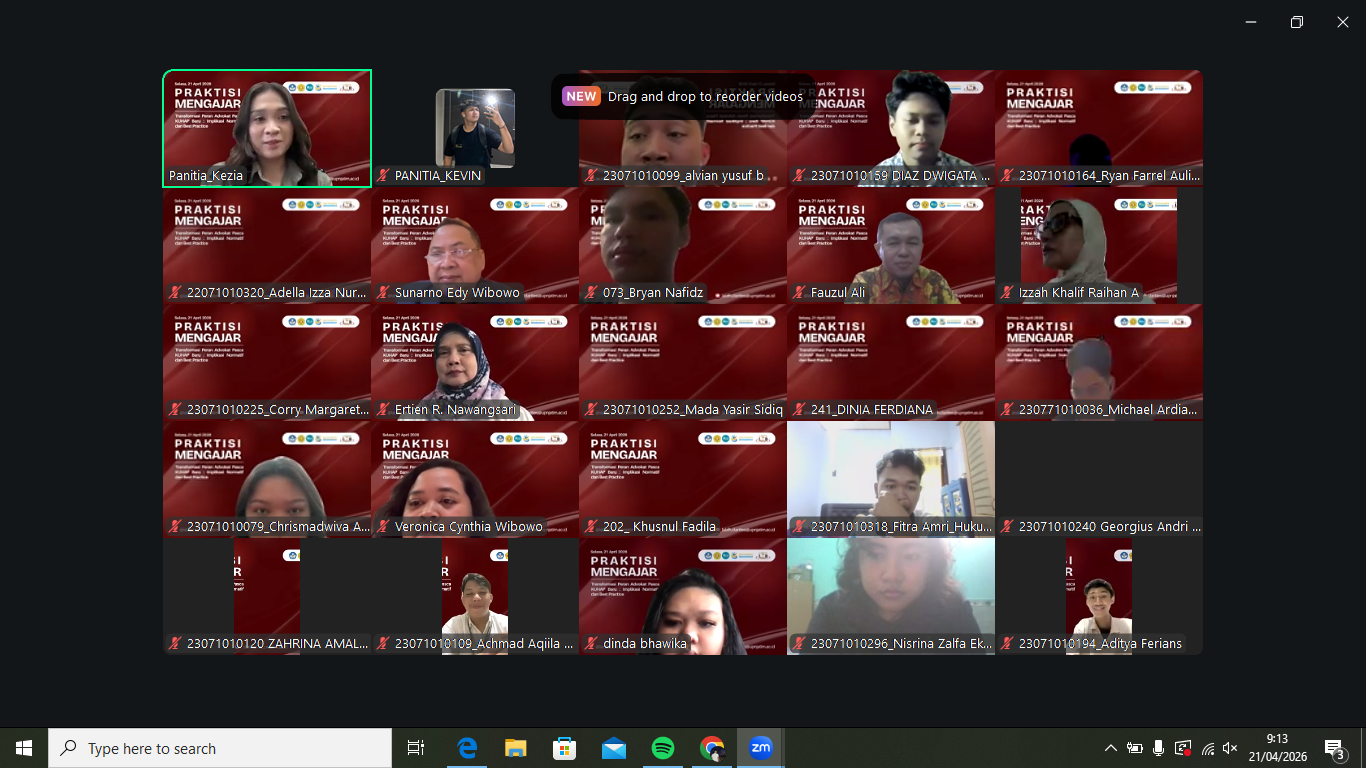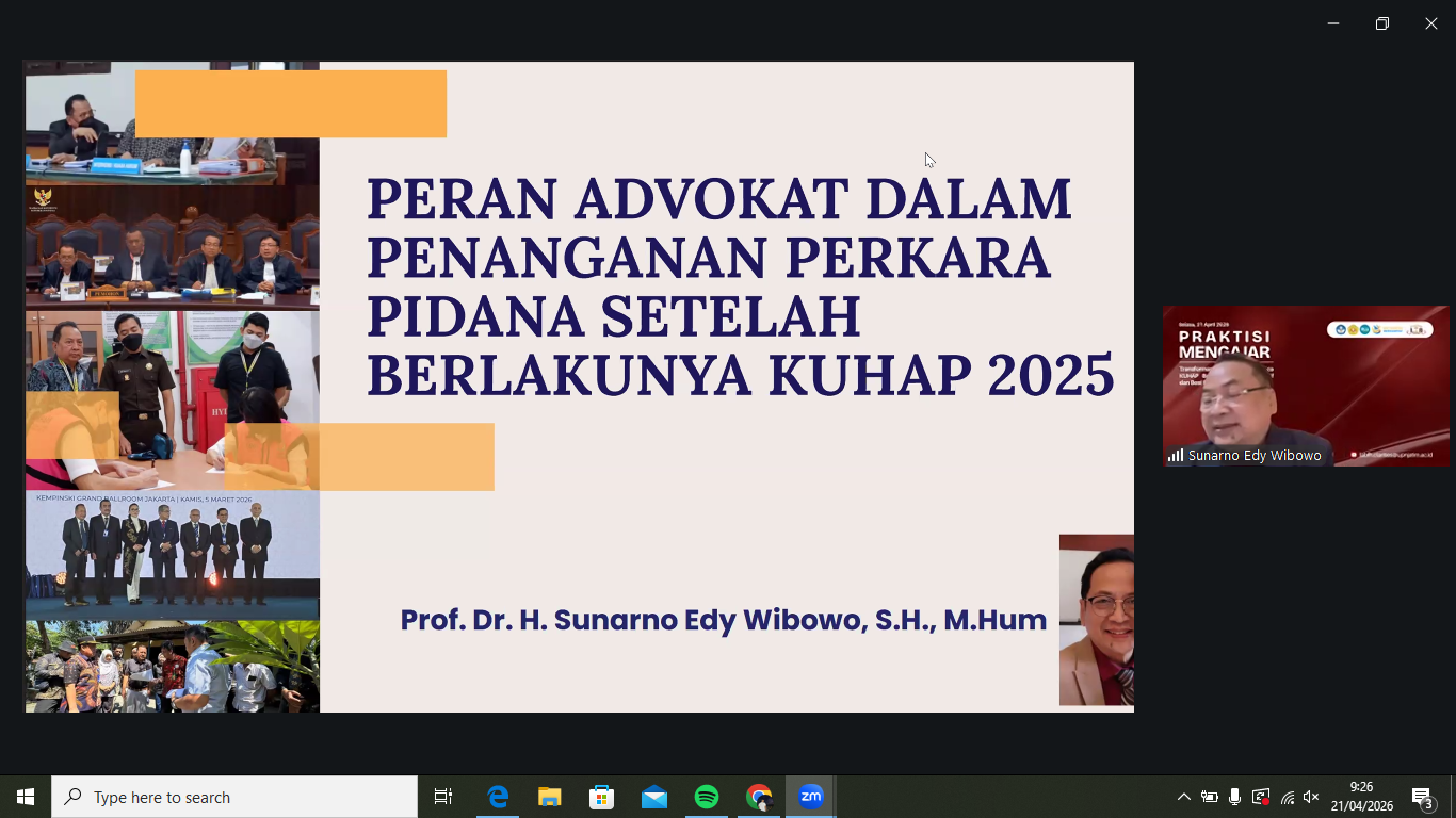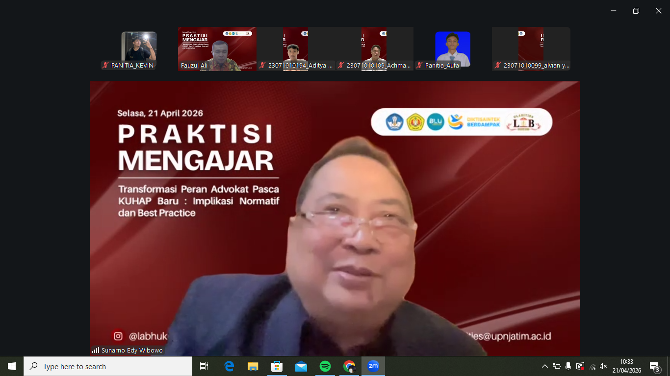 Surabaya, 21 April 2026 – Laboratorium Hukum “Clarities” Fakultas Hukum UPN “Veteran” Jawa Timur kembali menyelenggarakan kegiatan praktisi mengajar secara daring melalui Zoom Meeting pada Selasa, 21 April 2026. Kegiatan ini mengangkat tema “Transformasi Peran Advokat Pasca KUHAP Baru: Implikasi Normatif dan Best Practice” sebagai respons terhadap pembaruan hukum acara pidana di Indonesia. Hadir sebagai narasumber, Prof. Dr. H. Sunarno Edy Wibowo, S.H., M.Hum, dengan Fauzul Aliwarman, S.H.I., M.Hum sebagai moderator.