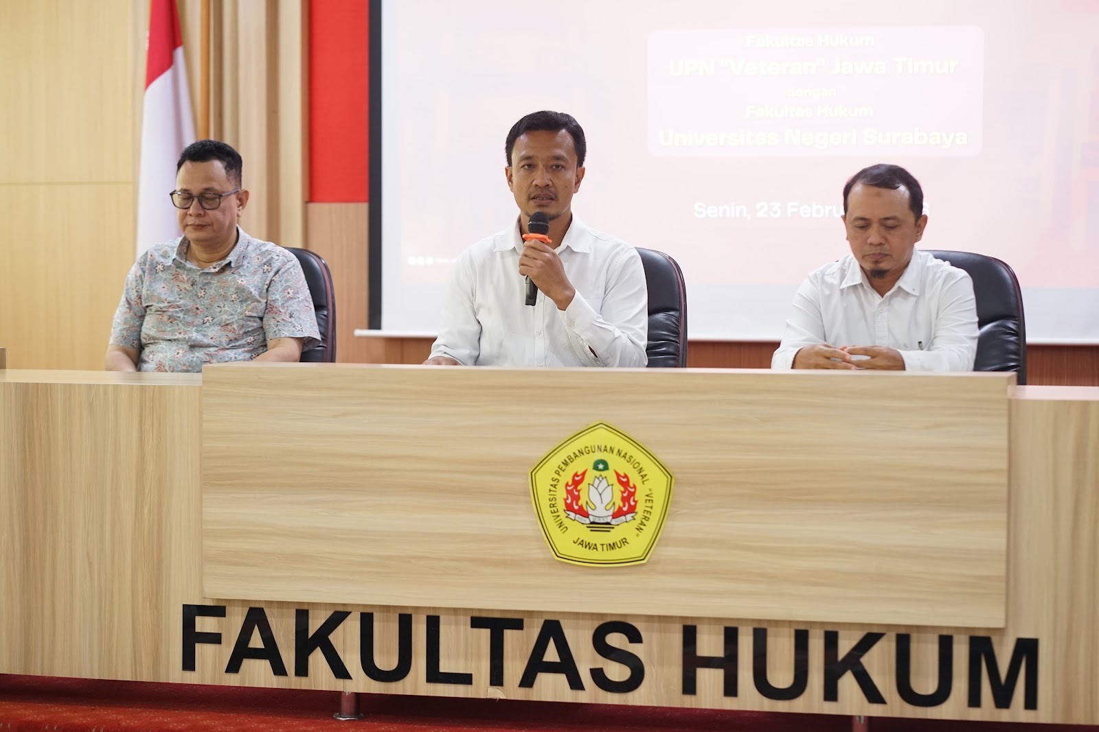 Sambutan selanjutnya disampaikan oleh Dekan Fakultas Hukum Universitas Negeri Surabaya, Arinto Nugroho, S.Pd., S.H., M.H. beliau mengapresiasi terjalinnya kerja sama antara Fakultas Hukum Universitas Negeri Surabaya dan Fakultas Hukum UPN “Veteran” Jawa Timur sebagai wujud sinergi antarlembaga pendidikan tinggi. Menurutnya, kerja sama ini tidak hanya memperkuat hubungan kelembagaan, tetapi juga membuka ruang kolaborasi akademik yang lebih luas dan berkelanjutan. Beliau menambahkan bahwa program pertukaran mahasiswa diharapkan mampu memberikan pengalaman belajar yang komprehensif bagi mahasiswa, baik dari sisi akademik, sosial, maupun budaya kampus. Kerja sama ini juga dipandang sebagai pintu masuk bagi pengembangan kerja sama lain, seperti riset bersama, pertukaran dosen, serta kegiatan pengabdian masyarakat.